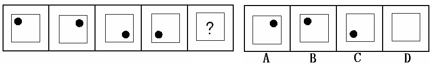 (答案:B。黑點(diǎn)在正方形中順時(shí)針移動。在第5個(gè)圖形中,應(yīng)該正好移動到左上角。)