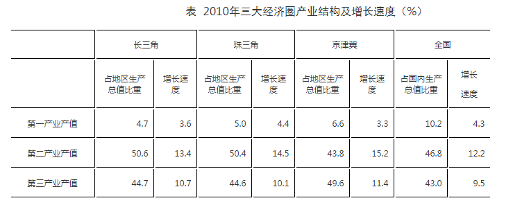 三大經(jīng)濟(jì)圈中,2010年三次產(chǎn)業(yè)增長速度均超過全國平均水平的有幾個(gè)?